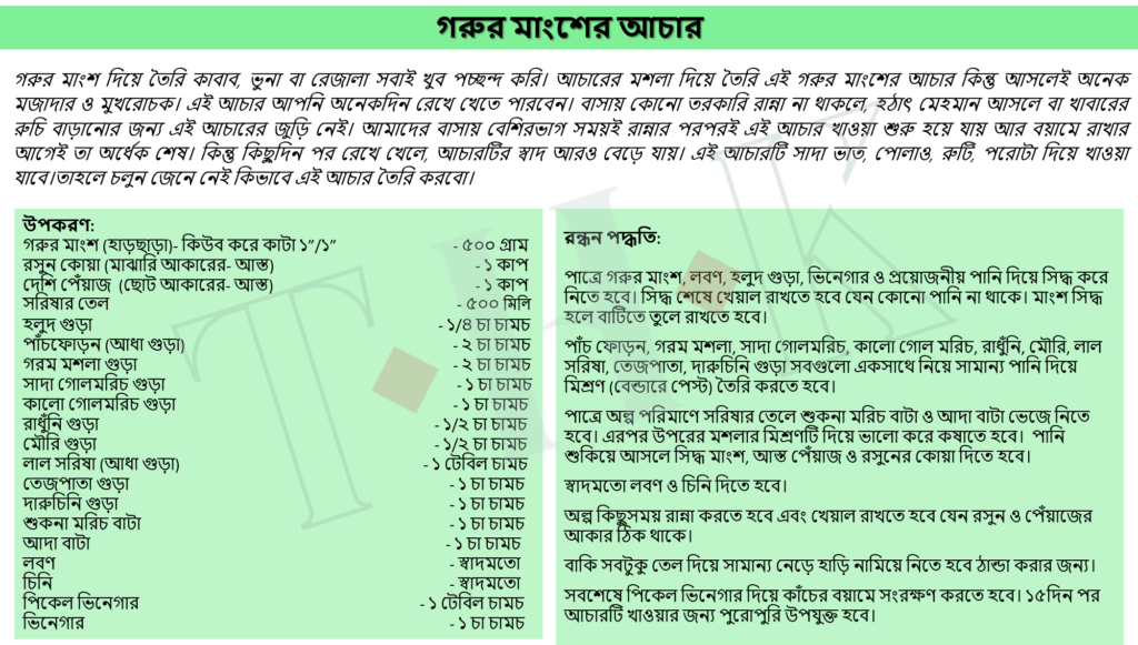 Beef is the most delicious meat out of all of them!! Change my mind! Joke aside, all kinds of beef dishes are truly delicious. Let it be, roasted, sauteed, stir-fried, curry. You can’t call it a proper traditional party in Bangladesh if it does not have at least one beef dish. We, Bangladeshi people, love our kebab, curry, and rezala. Aachar is one kind of South Asian pickle, using regional spices.