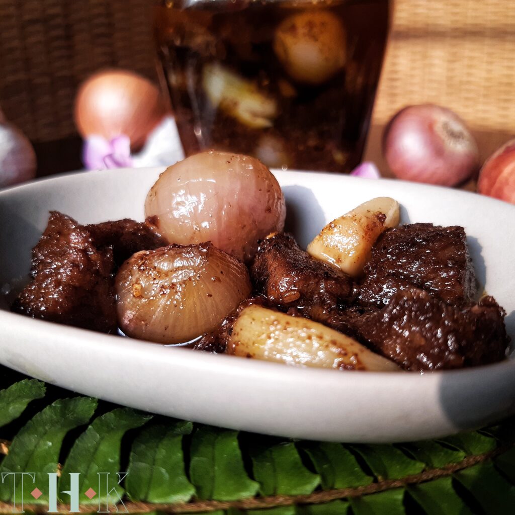 - Put beef cube pieces in a pot with salt, turmeric powder, vinegar, and water to boil it. When the beef is boiled, make sure that there is no excess water present. Take out the beef pieces and place them in a bowl.